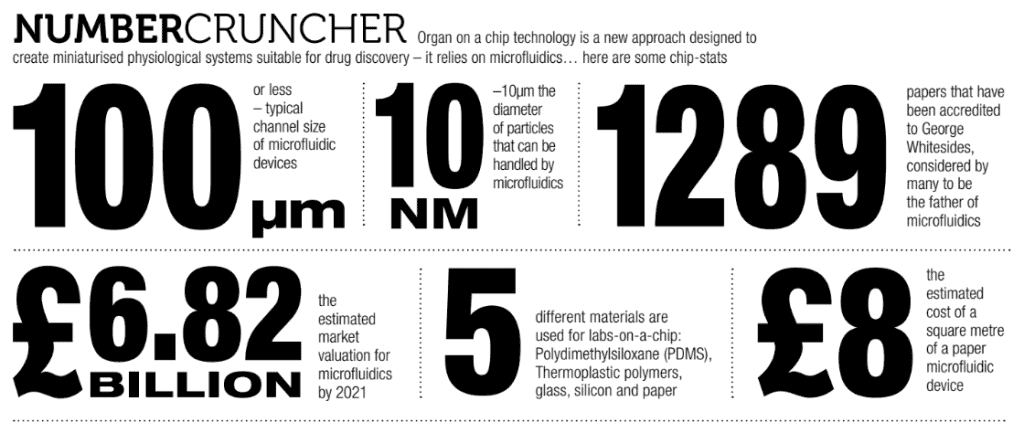 Organ on a chip technology is a new approach designed to created miniaturised physiological systems suitable for drug discovery – it relies on microfluidics. Here are some stats...