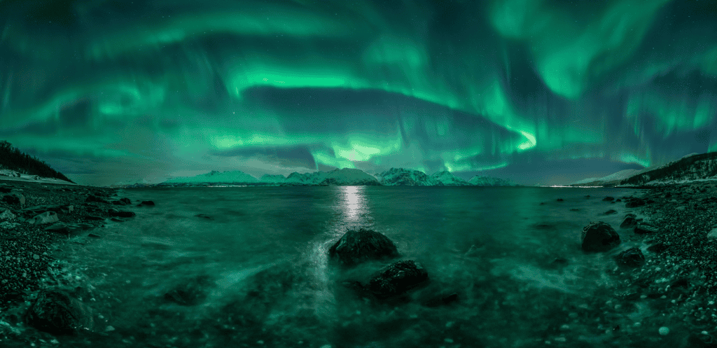 The vivid green Northern Lights dance above Lyngenfjord, the longest fjord in Troms county in Norway, tracing out the shape of the Earth's magnetic field above the waters.