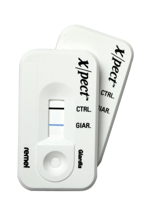 Direct detection of Cryptosporidium and Giardia from faecal specimens is also possible via a range of rapid lateral flow tests – Xpect Giardia (Figure 2), Xpect Cryptosporidium and the dual assay, Xpect Giardia/Cryptosporidium. Diluted sample is simply added to the sample window of the test unit and within just 15 minutes the result can be read. A line at the control level demonstrates that the test has been performed correctly. An additional line at the result level indicates that the test is positive for the target organism. The absence of this line indicates that the test is negative.