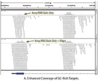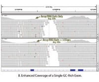 Supplementing the array-derived RNA baits with 1,000 xGen Lockdown Probes enhanced the coverage of many GC-rich targets, such as first exons (Figure 3A). Further, adding only three probes targeted at a single GC-rich exon improved coverage of that exon (Figure 3B).