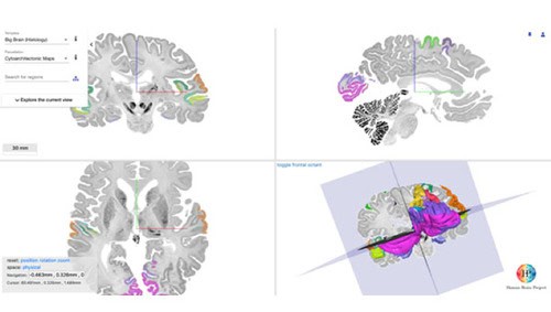 Image: Ultra-high -resolution 3D maps of cytoarchitectural areas in the Big Brain model. Users can navigate in the Big Brain, zoom in to get more details, and see how the brain is parcellated. Copyright: Amunts, Schiffer, Dickscheid et al.