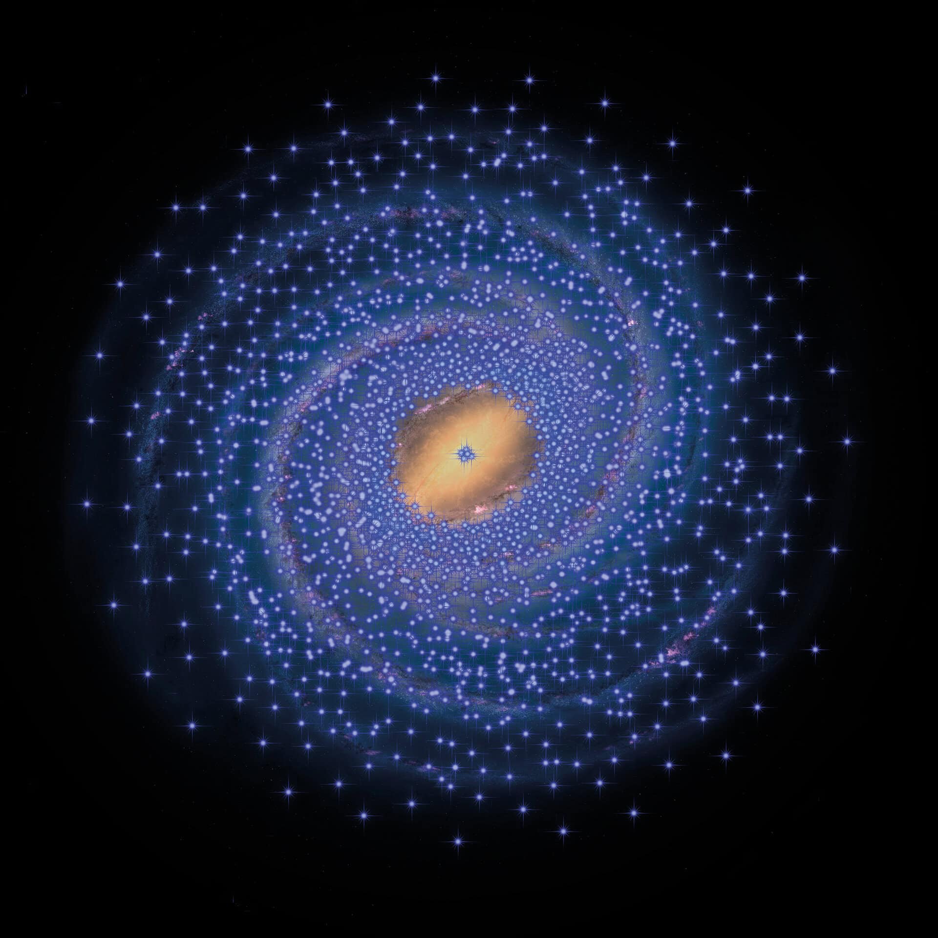 Figure 2: An artist's impression of the implied distribution of young stars, represented here by Cepheids shown as blue stars plotted on the background of a drawing of the Milky Way. With the exception of a small clump in the Galactic centre, the central 8000 light years appear to have very few Cepheids, and hence very few young stars.