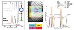 The simplest form of XPS analysis is a single point analysis, as shown in Figure 2A, such measurements can be made from areas down to about 10µm in diameter. Imaging XPS is possible by using either parallel detection systems or stage mapping (Figure 2B). Current state of the art capabilities result in elemental or chemical state images having a resolution of the order of 3µm. If XPS measurements are interleaved with Ar ion beam etch cycles then it is possible to produce a chemical composition depth profile (Figure 2C). This makes it possible to determine the composition of films that are much thicker than the escape depth of the electrons.