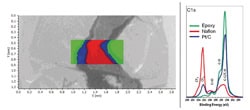 Optical image of the prepared MEA sample, with an overlay of the XPS map data, and average C1s spectra from the three identified phases (Green – epoxy, blue – Pt on carbon black, red – Polymer electrolyte). Some fluorine contamination from the membrane is visible in the Pt/C section.