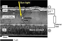 Scanning electron micrograph of a Cu(In,Ga)Se2 solar cell (cross-section) and its mode of operation.