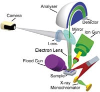 A schematic of the internal configuration of the Thermo Scientific K-Alpha, showing the principal components of a modern XPS spectrometer. The sample is irradiated with monochromatic X-rays, and the resultant photoelectrons are collected by a transfer lens. The photoelectrons are selected based on their kinetic energy by the hemispherical analyser, and collected at the detector. The low energy electron flood gun facilitates the analysis of insulating materials, and the ion gun permits sample cleaning and composition depth profiling.