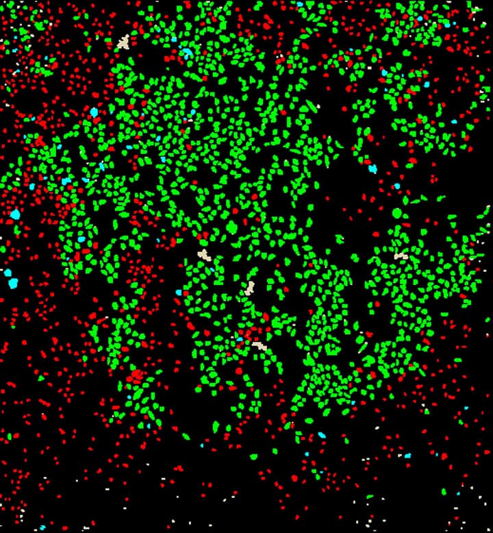 | Figure 1: High content analysis of protein kinase activation (ERK1/2) using an Acumen eX3 microplate cytometer. Panel A (left) shows a well view from a partially active well. Panel B (right) shows the same well with the cells classified by the Acumen eX3: green cells are active, red are inactive |