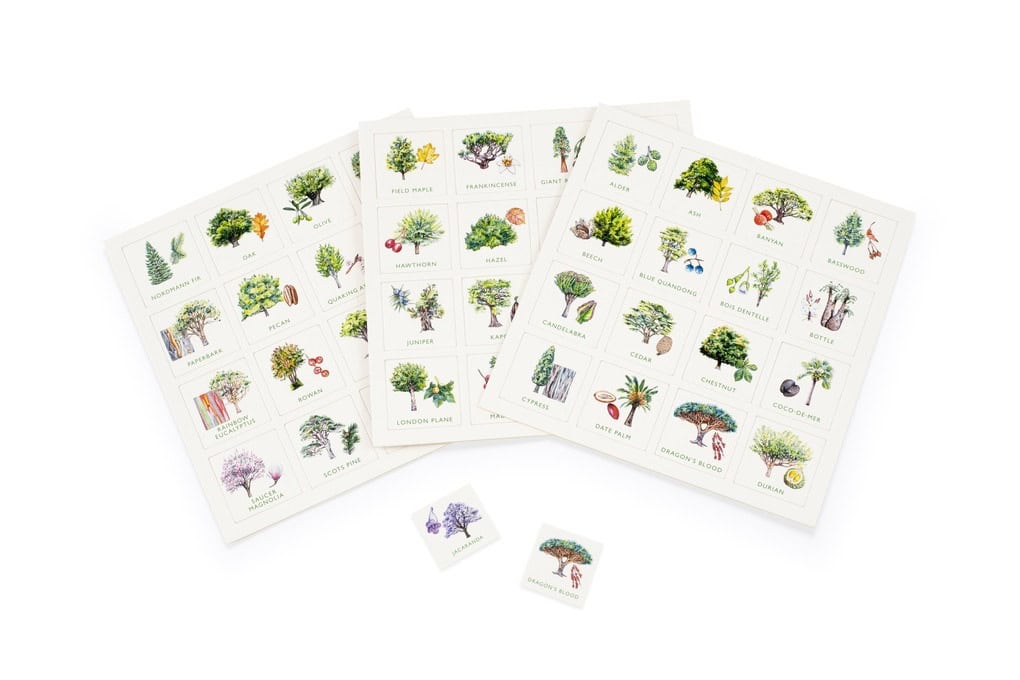 One player draws tree tiles one at a time from a cloth bag, reveals them to the players, then places them on a large foldable board that shows all 64 trees in the game. If you have the revealed tree in front of you, you place a bright red counter over it โ the winner is the first person who fills their board and shouts โbingo!โ