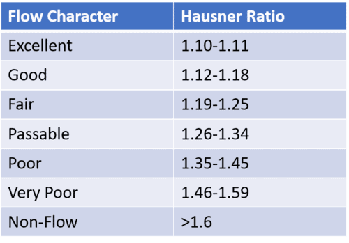 To carry out a tapped density measurement a fixed volume of powder is poured into a measuring cylinder which is then tapped either for a certain number of taps or until there is no further change in volume. Flow performance is inferred from HR โ the ratio of tapped to bulk (or poured) density โ in accordance with the classifications shown below:
