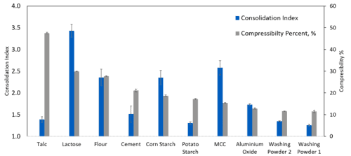 The figure above shows compressibility data alongside the CI figures. Compressibility is determined by measuring change in bulk density as a function of applied normal pressure, 15 kPa in this case. These results highlight Talc as the most compressible powder tested, much higher than Lactose.