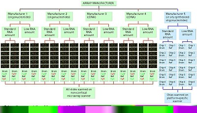 LGC is currently working towards improving the comparability and quality of array-based measurements through a number of MfB funded initiatives. Under the first programme, LGC led a consortium*, consisting of collaborators from UK industry, academia and National Measurement Institutes, to investigate the comparability of gene expression measurements on different microarray platforms. Five commercially available microarray platforms, that probe the human genome, were used to compare the differential expression status of a brain sample against a universal reference sample (Figure 1).