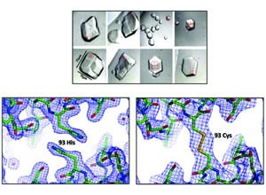 Figure 3: Microcrystals of FMDV capsids (top panel) and X-ray crystallographic analysis of the original (bottom left) and re-engineered FMDV capsids (bottom right). The original capsid shows two histidine residues (93His) whereas the re-engineered capsid shows the presence of the 93 Cys residues forming a disulfide bond between pentamers, as predicted.