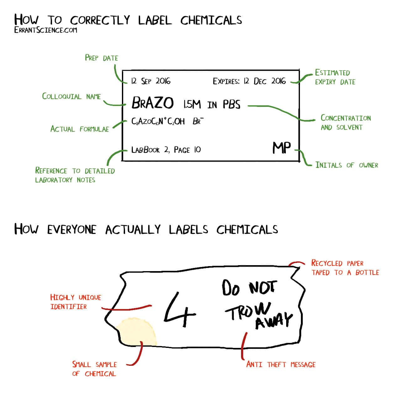Like any good health and safety system we have a labelling policy. And amazingly for us, it goes beyond “must have a label” – which is the policy in most labs and explains why they are full of tubes labelled “Sample 1”, “46Xb-2” and “Jeff’s DON’T TOUCH”. The last is particularly worth paying attention to because Jeff rides a motorbike and you don’t mess with a biker’s lab samples. In my lab, I try to insist that a label has several key things on it to help work out, first and foremost, if the mysterious substance is going to explode and who I should shout at if/when it does. So the first thing that absolutely must be included is initials. If two people in the lab have the same initials then they draw straws and one of them legally changes their name.Next is the date it was created/decanted. Dates are important because some tubes – ordinarily at the back of the fridge – contain life that is sentient enough to want to celebrate anniversaries of its existence. It is also incredibly helpful in tying in the prep to experiments and lab book notes (assuming you bother to put a date in the lab book). In some cases we put best before dates, but in most cases we either don’t know or it’s a lot longer than our project.