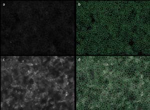 | Figure 3: a, DAPI staining of the nucleus. b, Identification of the nucleus by the software. c, FITC labelled stem cell marker (tra-1-81). d, area where the fluorescent signal is measure for each cell |