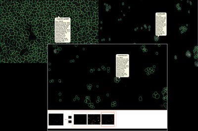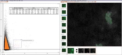 | Figure 4: Example images with the cells identified by the software. Highlighting an event brings up the event data for the fluorescent channel |