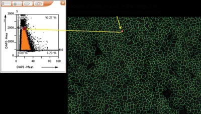 Figure 6: The DAPI image of the cells with the nucleus identified, with the linked data to the dotplot |