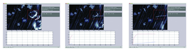 Figure 5: An example of following the dissolution of crystals in water. At the start (the left image) there are a number of crystals and two are marked with coloured squares and the dissolution of these crystals is tracked and displayed in the graph below using this colour coding. The red crystal, though large, disappears quickly and is dissolved by 200 sec. (the middle image). By 400 sec. (the right image) there has been a substantial reduction in the size of the blue crystal (and the other crystals) though it is not completely dissolved.[/caption]