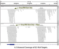 [caption id="attachment_35034" align="alignleft" width="200" caption="Figure 3: Spiking in individually synthesized oligonucleotide baits improves sequencing coverage of array-derived RNA baits. (A) Addition of a set of 1,000 xGen Lockdown Probes to array-derived RNA baits enhanced the coverage of many GC-rich targets, such as first exons; (B) supplementing RNA baits with three xGen Lockdown Probes targeting a single GC-rich exon improved coverage of that exon."]
