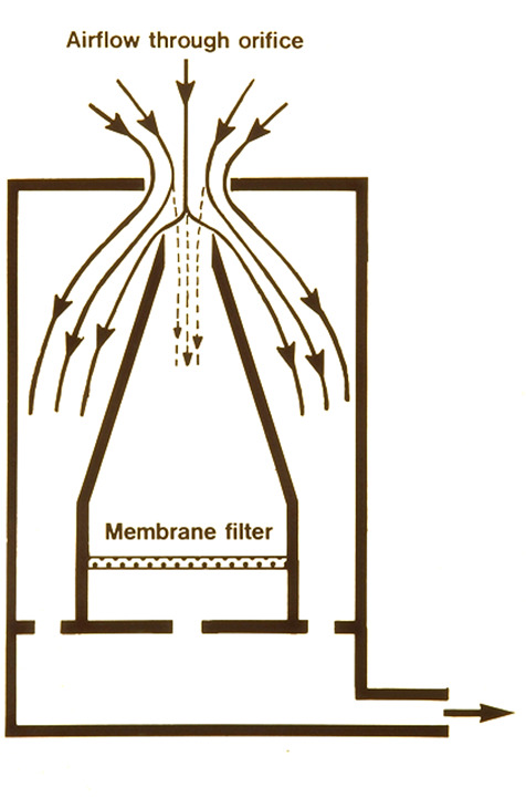 Yes. The internal geometry and inflowing air volume are critical design parameters (12). Approximately 97% of the inflowing air bypasses the nozzle housing the filter membrane. The volume flow rate ensures that air is not sucked out of the cabinet to distort the results.